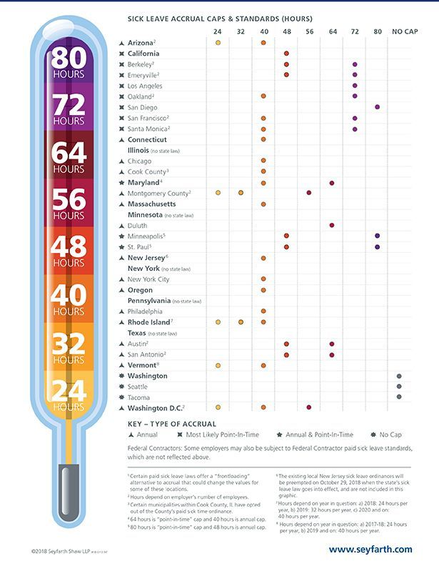 Seyfarth Synopsis: As the country’s paid sick leave epidemic continues to spread, we are committed to providing you periodic updates on the states and municipalities nationwide that have enacted laws and ordinances. See below for paid sick leave law accrual cap information, including accrual amounts and types of caps. Each listed location contains a paid sick leave law or ordinance that either is currently in effect or scheduled to go into effect in the coming months1.